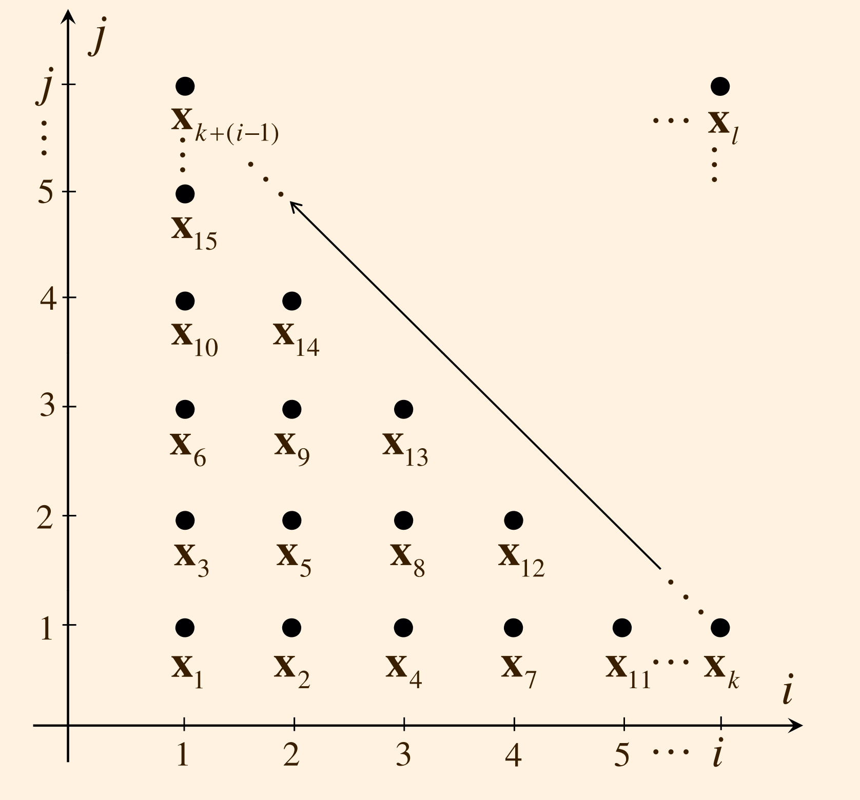 图 1.1 N 2 \mathbb{N}^2 N 2 元素的序列标记。N 2 \mathbb{N}^2 N 2 中元素的排序如箭头所示,沿着负斜率为 -1 的对角线经过N 2 \mathbb{N}^2 N 2 中的点。这里k = g ( i , 1 ) k = g(i, 1) k = g ( i , 1 ) ,k + ( i − 1 ) = g ( 1 , j ) k + (i-1) = g(1, j) k + ( i − 1 ) = g ( 1 , j ) ,其中i = j i = j i = j ,且l = g ( i , j ) \mathcal{l} = g(i, j) l = g ( i , j ) 。